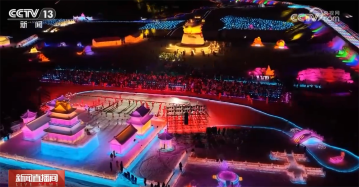 临近零点,一场融合科技光影与民族歌舞的跨年演出在晶莹闪烁的冰雕舞台上精彩亮相。